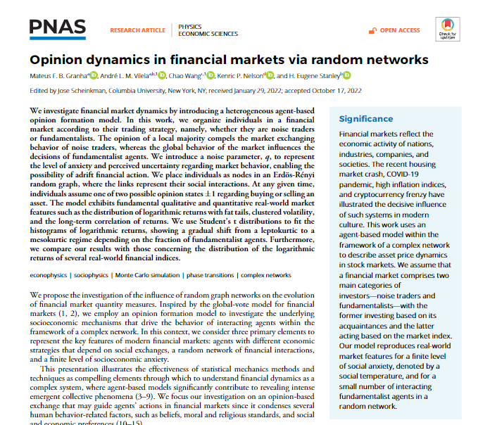 11月29日,国际顶级综合性学术期刊《美国科公司院刊》(PNAS)发表了经管公司王超教授题为“Opinion dynamics in financial markets via random networks”的高水平研究成果。该成果受国家自然科学基金项目(批准号:72071006、61603011、62073007)资助,与巴西伯南布哥大学André L. M. Vilela团队、美国波士顿大学H. Eugene Stanley团队共同完成,通讯作者为公司王超教授。