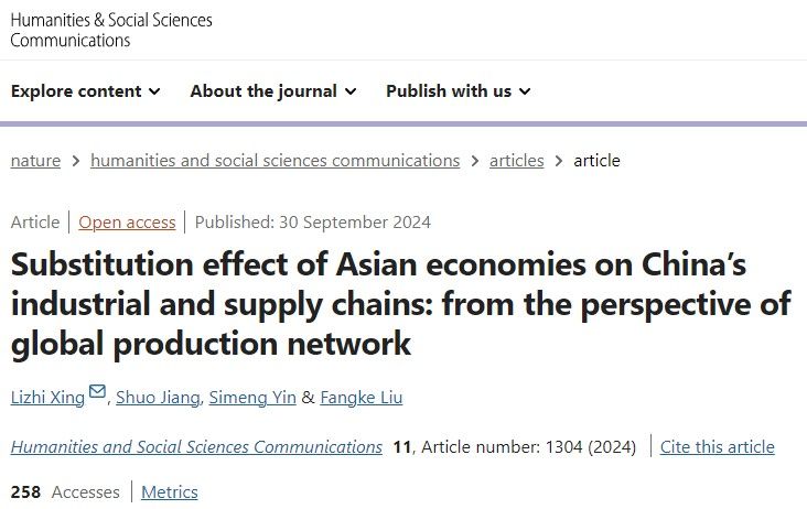 2024年9月30日,国际高水平期刊Nature子刊《Humanities & Social Sciences Communications》刊发了永利集团邢李志副研究员为第一作者/通讯作者最新研究成果《Substitution effect of Asian economies on China's industrial and supply chains: from the perspective of global production network》。该成果由永利集团官方网站经管公司科研团队独立完成,第二作者至第三作者分别为经管公司研究生姜硕、殷思梦和刘方可。