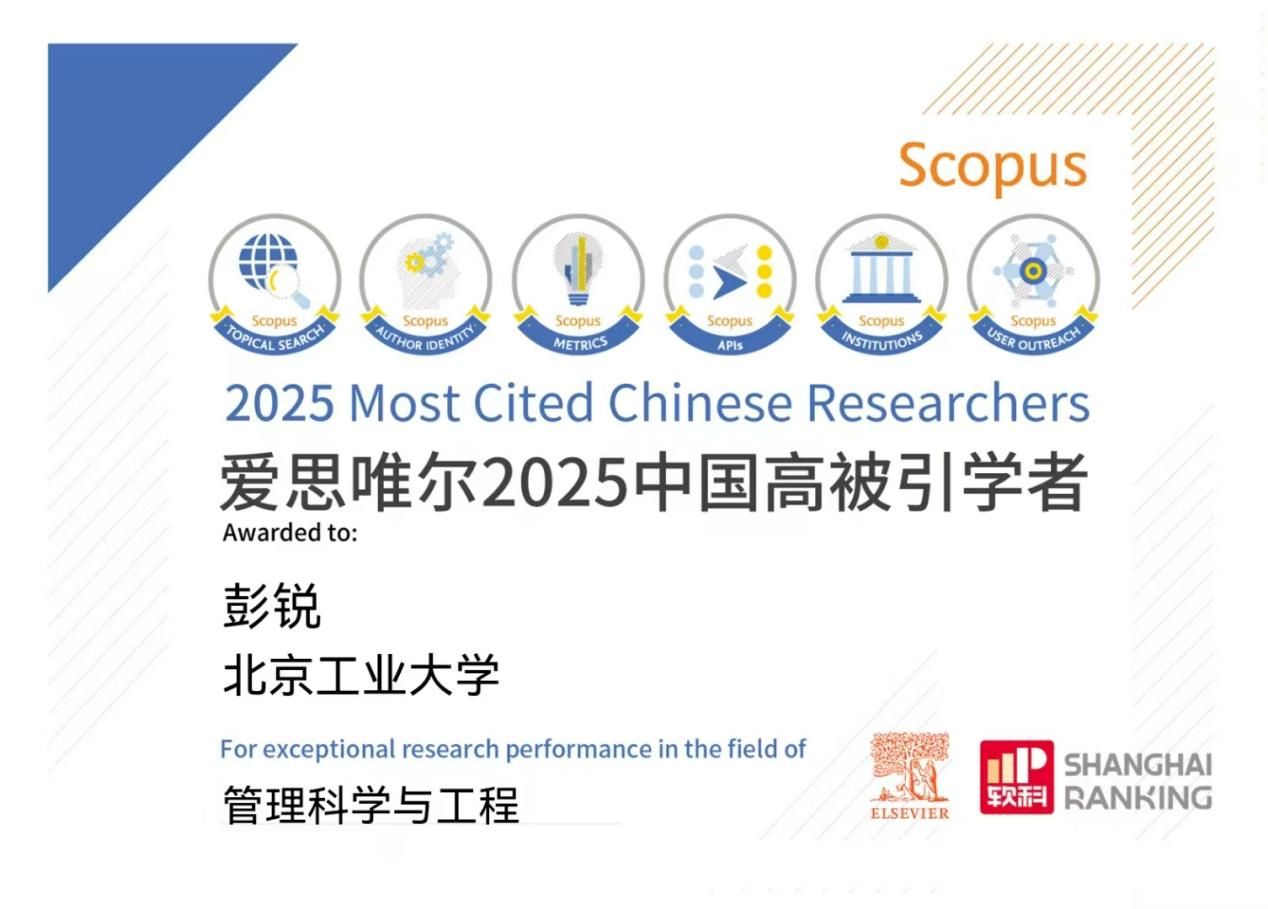 2026年1月,爱思唯尔(Elsevier)发布2025年“中国高被引学者”(Highly Cited Chinese Researchers)榜单。永利集团官方网站经管公司彭锐教授第八次入选此榜单。